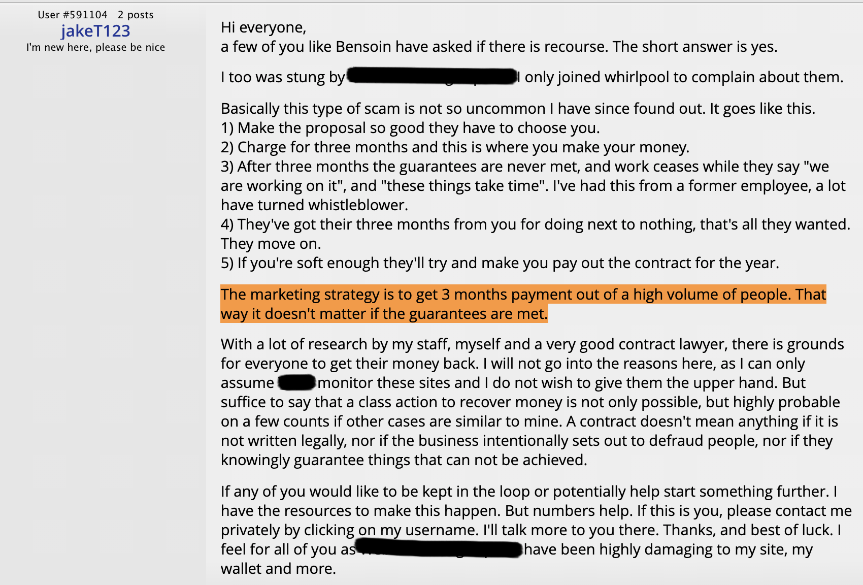 NOTE: it's not our job to point the finger, nor do we want this guide to become a smear campaign. It's not how we operate and it doesn't align with our company values. Therefore we have blacked out the identities of the companies responsible for these outcomes. (by the end of this guide you will know how to spot a scam and stay well away from these kind of companies.)