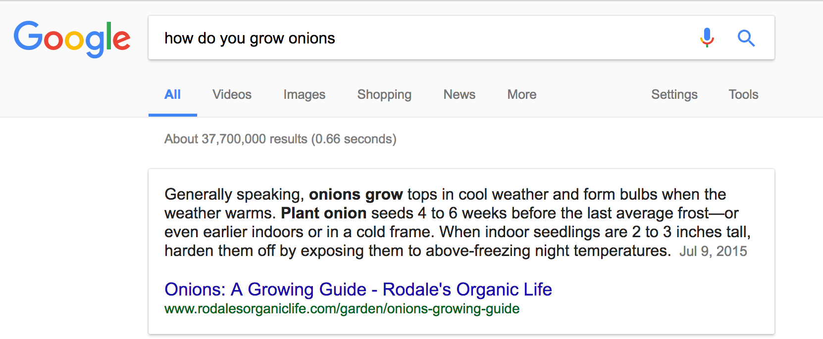 You ask, “How do you grow onions” and receive a healthy list of search results. In the lead are a couple of paid ads for local companies selling seeds.