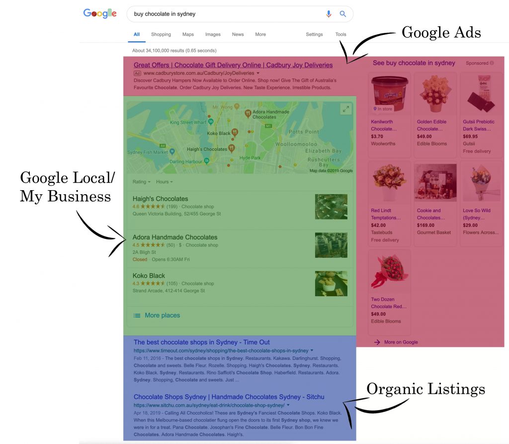Google Local/My Business: This area is allocated for local business listings. Google pulls the most relevant listings from Google My Business to display in this area. Local SEO strategies will help you rank in this area.